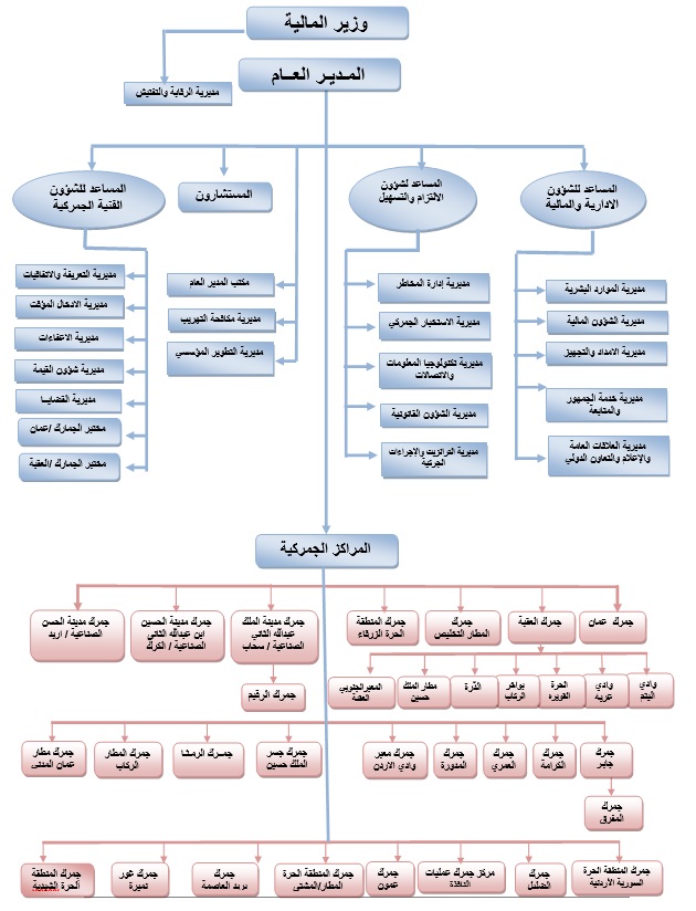 ويوضح الهيكل التنظيمي لدائرة الجمارك أدناه الإرتباط الإداري للمديريات والمراكز الجمركية:
